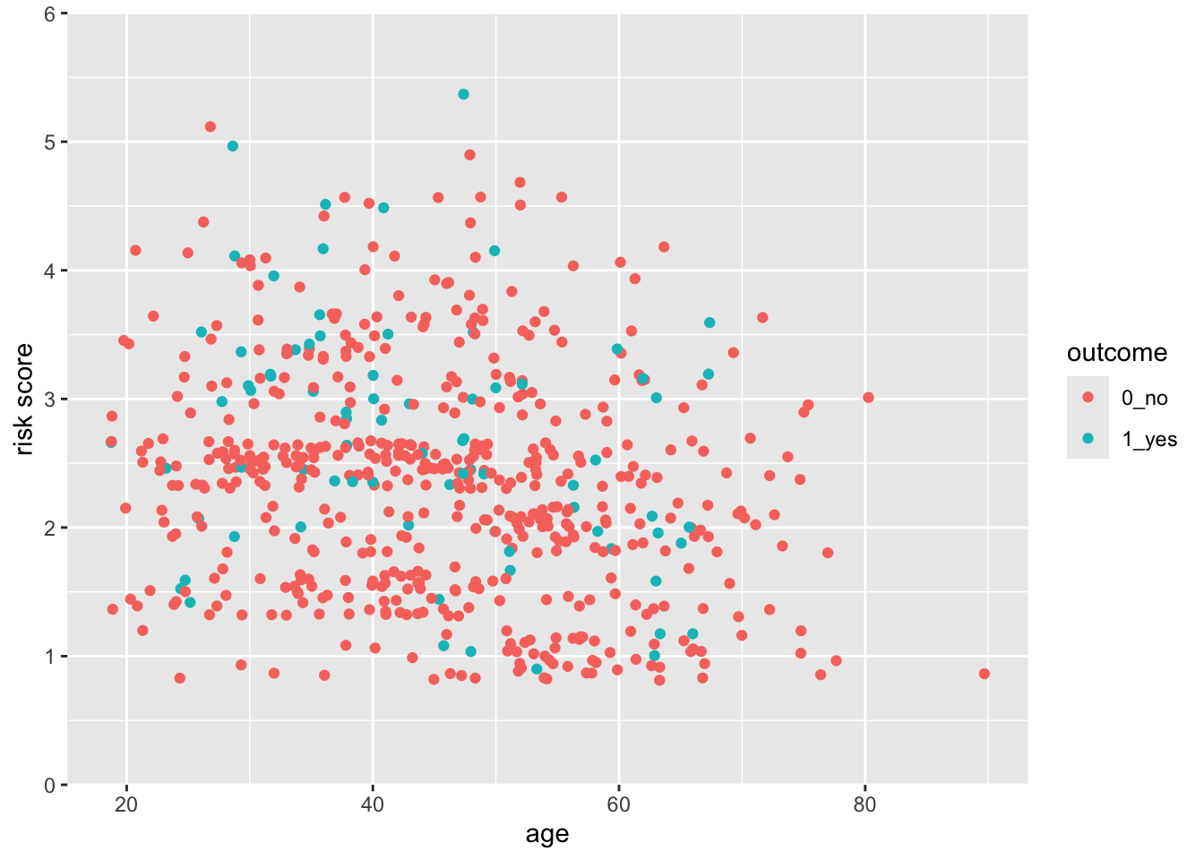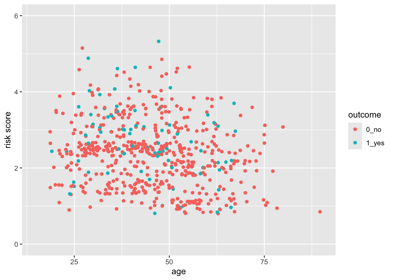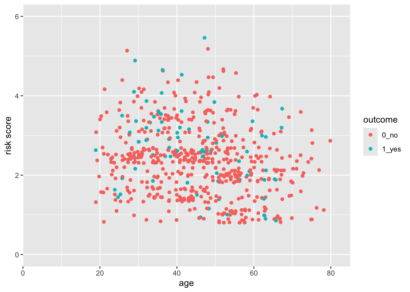 aes(x = age, y = risk, color = outcome) +