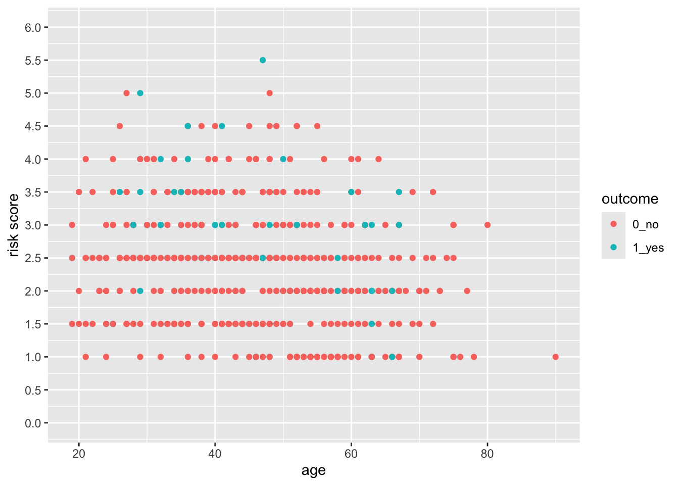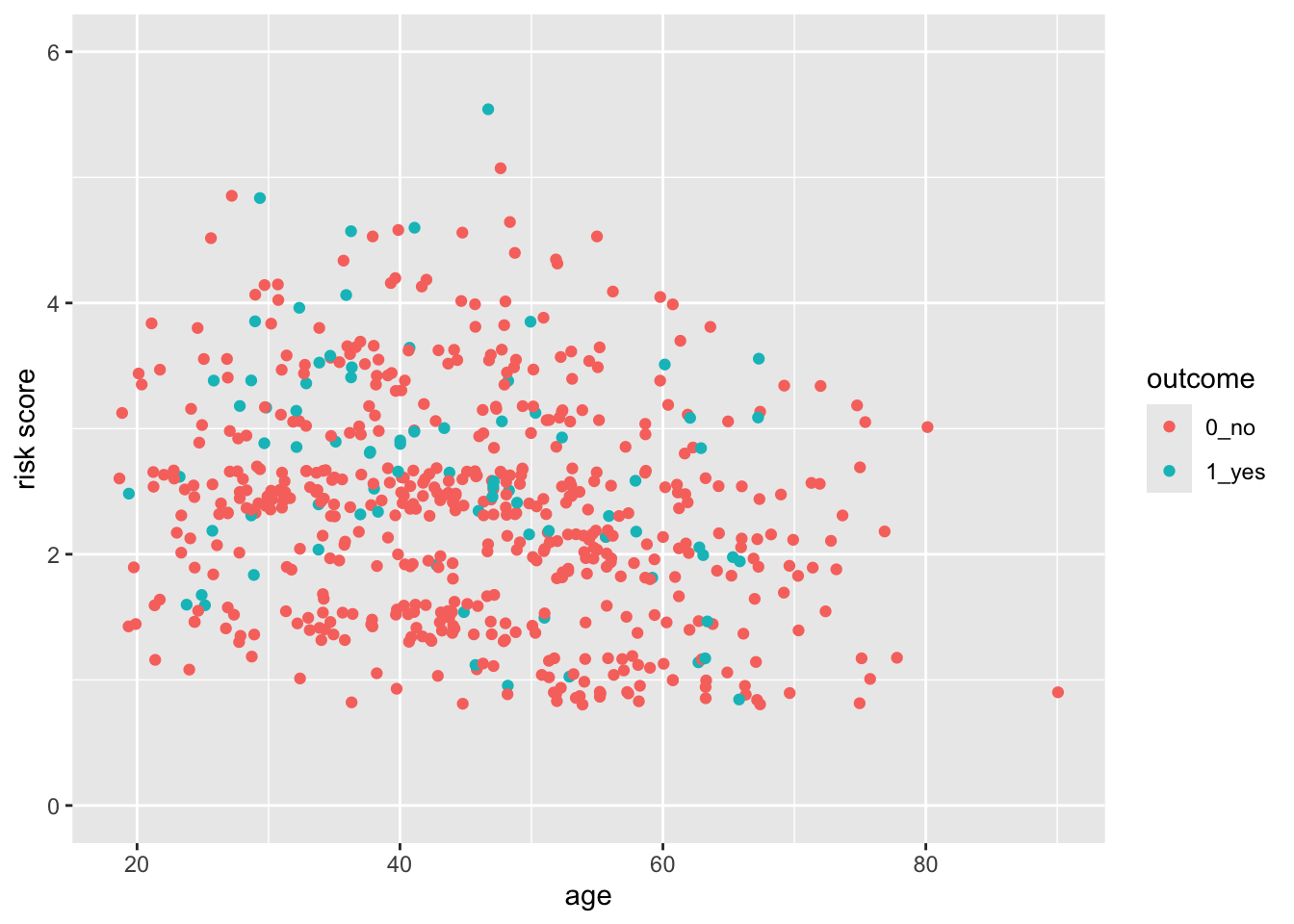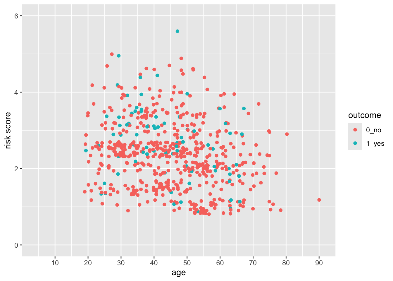aes(x = age, y = risk, color = outcome) +