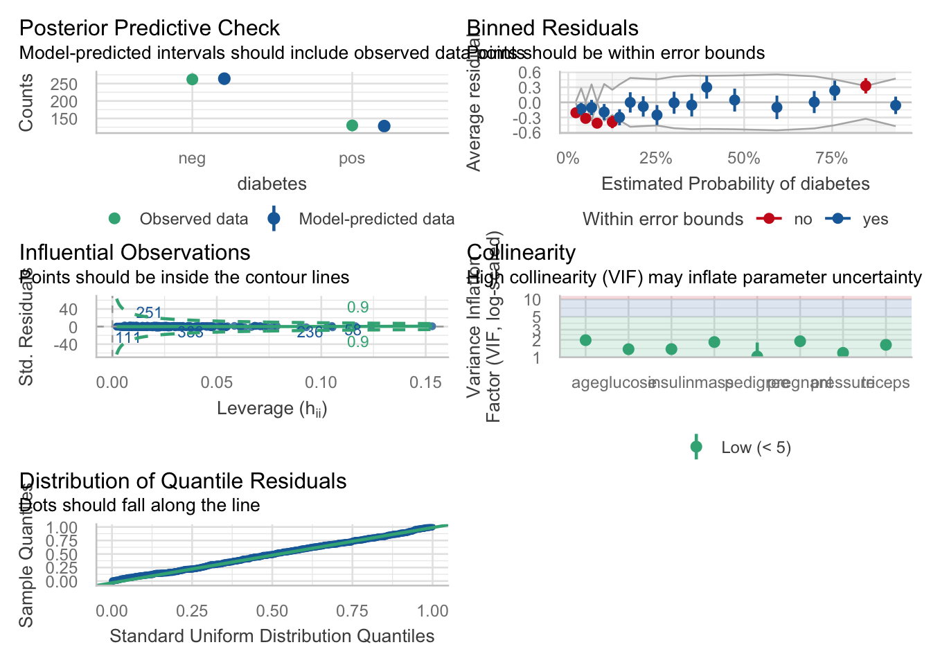 This generates graphs with nice subtitles to help you interpret the output. Big deviations should make you worry about one or more of the model assumptions, and may require rescaling one of your predictors.