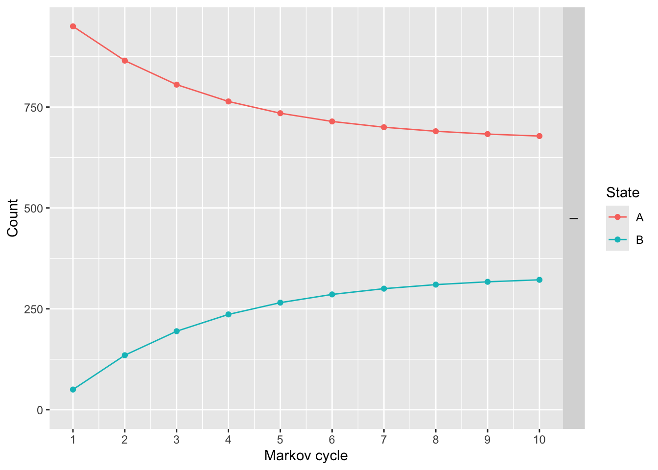 Now we are ready to run the model. For our initial model, we will run it through 10 cycles (in this case, years). The run_model() function takes the strategy object and the number of cycles as arguments, and returns a model object that contains the results of the simulation. By default, tje model will run for 1000 persons beginning in the first health state (state A).