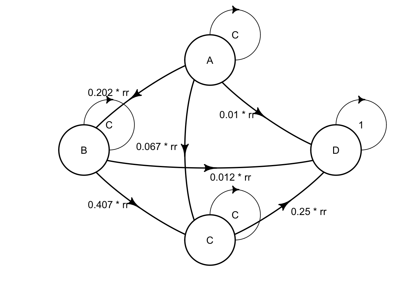 The combination therapy has a RR f=of 0.509, and the define_transition function will accept the value C (the complement) for whatever is left over to reach a probability of 1. so this has the following transition probabilities:
