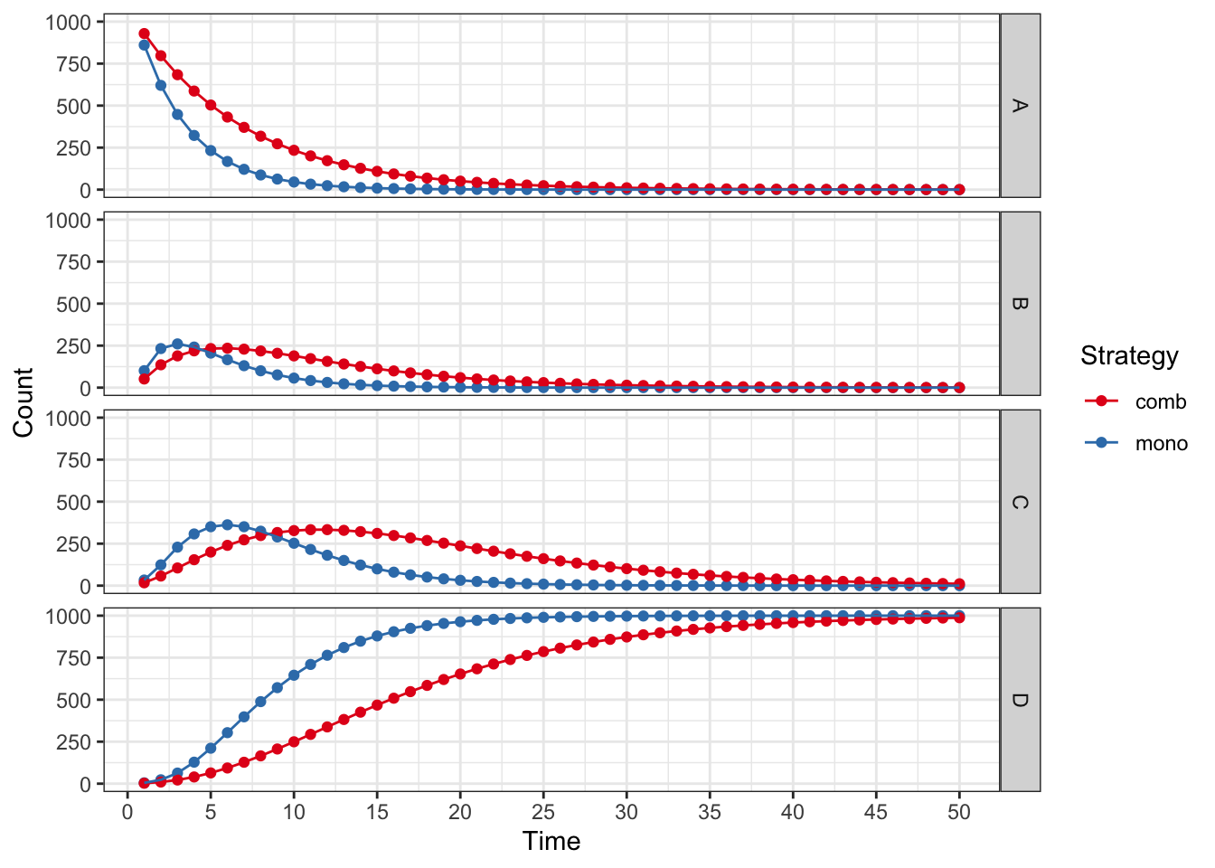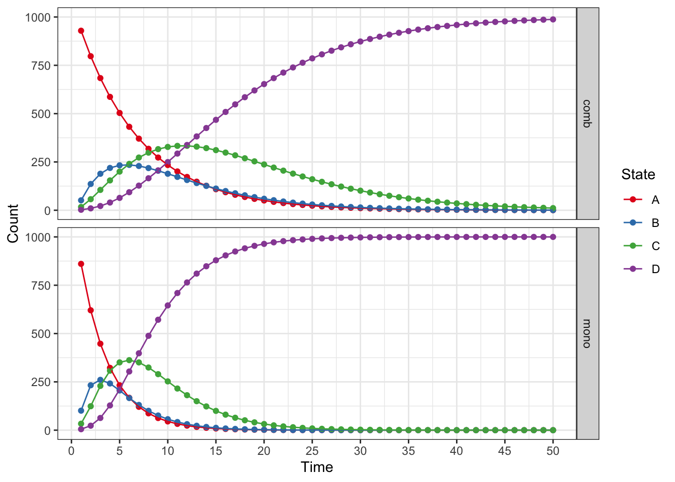 The transition probabilities for monotherapy are as follows: | | A | B | C | D | |—–|—–|—–|—–|—–| | A | .721|.202 |.067 | .010| | B | 0 | .581| .407| .012| | C | 0 | 0 | .750| .250| | D | 0 | 0 | 0 | 1 |