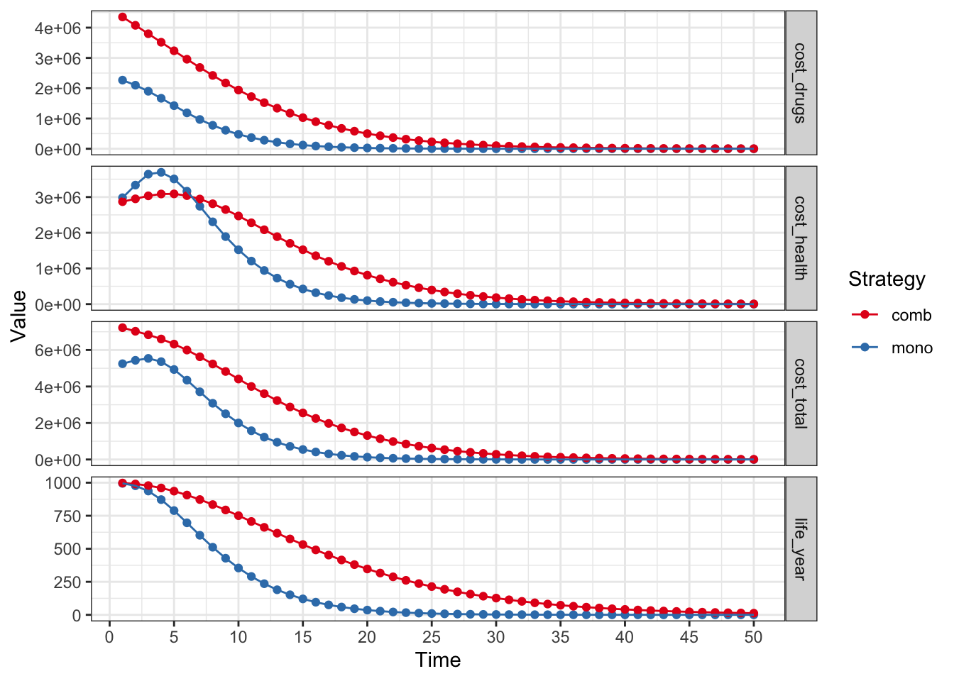 Now we use the define_strategy() function to combine the transition matrix and the state values into a model. The define_strategy() function takes the transition matrix and the state values as arguments, and returns a strategy object that can be used to run the model.